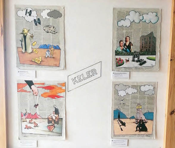 No se trataba solo de recortar siluetas y pegarlas sobre las hojas de periódicos, sino “dibujar, recortar, pegar, perfilarlo todo con la plumilla. Mi intención era hacerlo con una estética desenfadada, tipo cómic, nada serio, separarlo de mi labor habitual como escultor”. Una de las ideas era situar a los personajes fuera del contexto de las películas a las que pertenecen. En el caso de El gran Lebowski, vemos a Dude, el personaje que encarna Jeff Bridges en el film de los Coen, bebiendo un cervezaa Keler en un guiño de Oribe al espacio en el que acabaría exhibiendo su obra.
